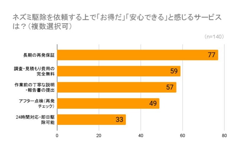 ネズミ駆除サービスに関する調査では、140名の回答者に「お得だ」「安心できる」と感じるサービスについて尋ねたところ、最も多くの支持を集めたのは「長期間の再発保証」で77件の回答がありました。